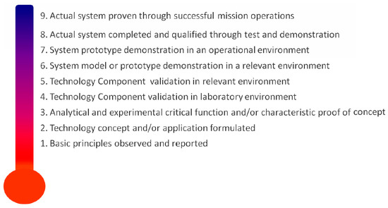 Objective assessment of progression/disruption requires measures of technology state/progress. One measure, Technology Readiness Level (TRL), was conceived by NASA to characterise technology status for use in space missions and is now supported by the European Association of Research and Technology Organisations (EARTO). It includes well defined characterisations and associated measures of technology state in a domain. The measures are shown in Figure 3. As a well-recognised, domain-specific quantization of a technology state, it is relevant to this paper’s goal. It does not, however, address the issue of disruption itself or rate of change of technology state, which could be added by considering for example technology cost in a domain (say TRL/£) or TRL change over time.