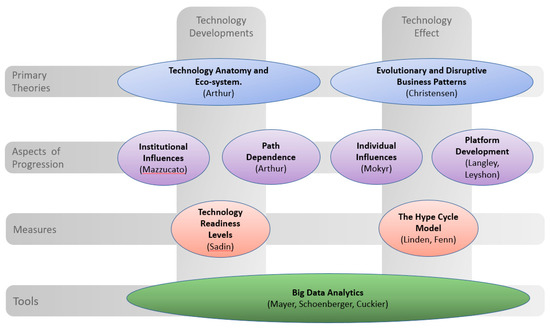 We present an approach which incorporates a range of measures to give an integrated and automated index of technology progression. The approach draws on two key theories, Arthur’s model of technology’s structure (2009) [7] and Christensen’s model (1997) [4] of dynamic behaviour in technology related markets. It is underpinned with the work of Mazzucato (2015) [8] on the foundational role of government institutions in supporting disruptive technology evolution, of Arthur (1994) [9] on path dependence, Mokyr (2016) [10] on ‘tinkering’, and an emerging body of work on the economic role of digital platforms (for example, Langley and Leyshon (2017) [11], Srnicek (2017) [12] and McAffe and Brynjolsson, (2017) [13]. Work from Martin (2005) [1] suggests the geographic aspects of knowledge development. Lastly the model draws on under-pinning practical approaches to measuring technology progression including approaches drawn from the big data domain. Christensen’s theories have seen significant criticism over the past decade, most recently Lepore (2014) [14], arguing his characterizations are too simplistic and not representative of real situations, albeit that at a macro level his key concepts are useful.