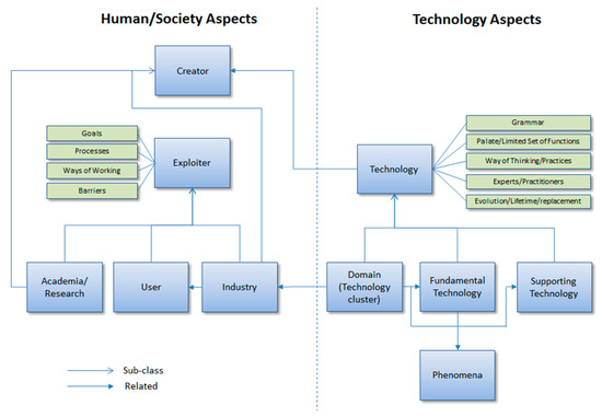 Arthur (2009) [7] describes technology’s anatomy and ecosystem offering some general unifying concepts. He classifies technologies as follows: fundamental, based on their defining physical properties, compositions (domain clusters) of other technologies and, lastly, supporting (enabling other technologies to succeed). Arthur suggests key technologies characterise a design approach/viewpoint, and describes an ecosystem of producers (academia, government, industry) and consumers. We formalise Arthur’s concepts in information theory terms, as well as integrating key concepts in the other research. This enables the definition of a machine describable model and consideration of how it might be populated. Arthur suggests that as technology develops it drives a set of support tools, ways of thinking, and a form of grammar and expertise which reinforce a specific set of approaches in line with the technology’s capabilities. Institutions and corporations develop around a technology to deliver the skills and capability to support it. These aspects of Arthur’s description of technology provide a structural model which could be used to capture the state of technologies and is used in this paper to provide a potential framework for technology assessment. Disruption by a new technology typically results in not only the technology being replaced, but also the skills, ways of working and competitive advantage for specific organisations also becoming obsolete (a process particularly addressed by Christensen). Arthur’s macro-model of the technology ecosystem is explored in greater depth in part 3.