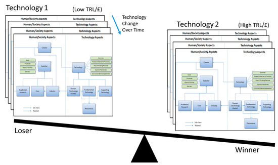 In the human/societal factors of Arthur’s model, there are societal groups interacting with the technology such as the creators, (individuals, academic institutions, and commercial organizations) and exploiters. Exploitation is characterized by both need and barriers. If we capture the state of various technology ecosystems over time using our formalization of Arthur’s model (Figure 6) we can potentially compare them using Christensen’s model (measuring their utility/readiness against cost) (see Figure 7). For each technology, we can add information related to its potential disruptive effect (as characterized by TRL/£, position on the Hype Curve, or potentially other indicators such as its geographical spread). If Figure 6 is considered as a snapshot in a time series, then we have an integrated model which represents both the nature of technology, Arthur (2009) [7] and technology disruption, Christensen (1997) [4]. Further work is in progress to generate such an integrated model described in UML.
