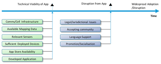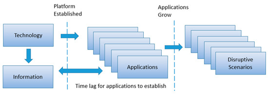 Over time, smartphones have become more viable because of technologies such as lithium batteries and other fundamental developments which reduced weight and increased run-time improved usability in a broad consumer market. As a result, smartphones reached a tipping point (Gladwell, 2000) [26] to become firstly disruptive, but then an incumbent technology, supporting many applications (phone, navigation, social interaction, photography, etc.). Once the smartphone developed as a platform there was an opportunity for external developers to exploit the platform (Simon, 2011 [27]), but this process takes time. Early smartphones were limited to basic web browsing and navigation, but after series of iterations of the platform and business models, more complex apps such as Airbnb and Uber developed. The ability to exploit the platform may not be simply technological; it is also related to available data (social media, mapping data, etc.), or market need (financial viability) by the platform. A key element of the progression is the significant drop in the cost of entry to provide a commercial offering because of the platform’s inherent level of support for easy distribution, payment system support, data, etc. This allows smaller innovative organizations to deploy as easily as existing businesses; Brackin, Hobona and Jackson (2014) [24] have characterized this characterization shown in Figure 8 (identifying a significant delay from platform deployment to application disruption. In this model the deployment time lag can also be due to regulatory, legal or safety constraints (as, for example, in the case of Uber).