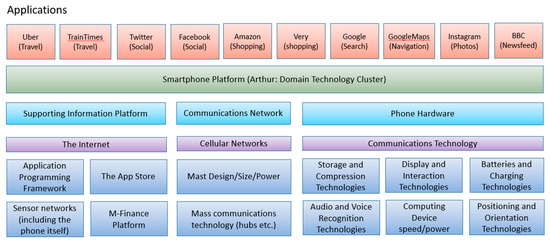Today’s smartphone platform meets Arthur’s (2009) [9] criteria for a technology domain. It is a collection of technologies which in combination provide a powerful platform. It also follows the platform pattern described in Langley and Leyshon (2017) [11] and Srnicek (2017) [12]. The smartphone platform is more than the technology in the phone itself; this was true even of previous generations of mobile phone (which were dependent on the cell network). The smartphone platform includes the internet, the app store infrastructure supporting it, m-commerce, social media, underpinning mapping and routing information, and on-line sources of sensing. See Figure 9.