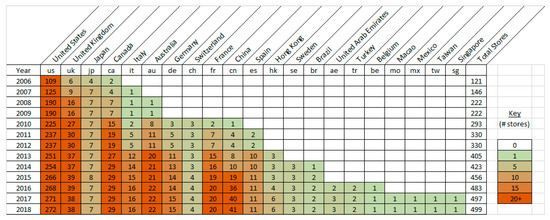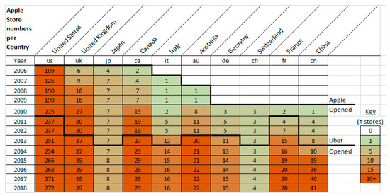 The cell numbers show the number of stores open in that country in each year. This offers potentially a more detailed assessment of smartphone deployment. The measure indicates the level of adoption country, region and place. Figure 12 shows the first stores outside the USA were in 2006 in London and Belfast, followed by a handful of locations in 2010, and then significant expansion in 2017.