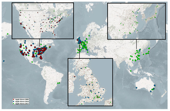 Global Apple Store openings 2006–2017 (World Mercator Projection).
