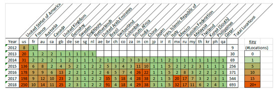 Similarly, the locations from the Uber website (as archived in the Wayback Engine) for each year since 2012 were gathered (by automated scraping) and collated. Results are presented in Figure 14 (tabulated) and Figure 15 (geographically) for the top 20 countries where Uber deployed.