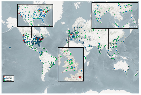 Global Uber supported cities 2012/2017 (World Mercator Projection).