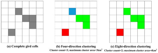 A clustering approach is proposed to analyze the spatial pattern of those grid cells (called high-density grid cells) whose density values larger than a certain threshold (Q5). The aim of this approach is to group neighboring high-density grid cells into a cluster (Figure 1). Neighboring high-density grid cells were found by searching in either the four-direction clustering or the eight-direction clustering from an original high-density grid cell. After clustering, the number of clusters and the maximum area of a cluster was calculated for all the urban areas in each prefecture-level division. Finally, the above two measures (cluster count and maximum cluster area) were compared among different prefecture-level divisions, for which there was at least a single cluster.