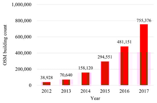 Figure 2 shows the development of OSM building counts in China from 2012 to 2017. In 2012, there were 38,928 OSM buildings, but this value increased to 755,376 by the end of 2017, almost 20 times that in 2012. This demonstrates that the OSM building data have significantly developed in recent years.