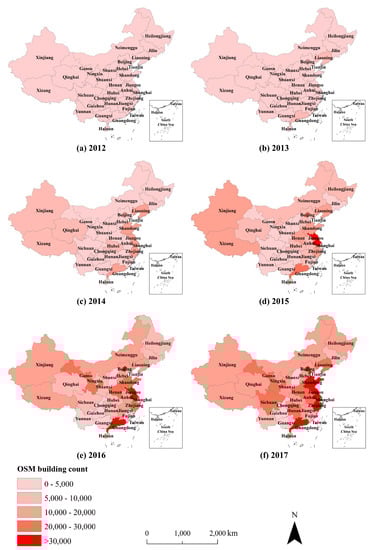 - OSM datasets: Buildings and roads in the OSM datasets of China for 6 years (2012–2017) were obtained from http://download.geofabrik.de/index.html. Each OSM dataset was obtained for the last month (December) of each year.