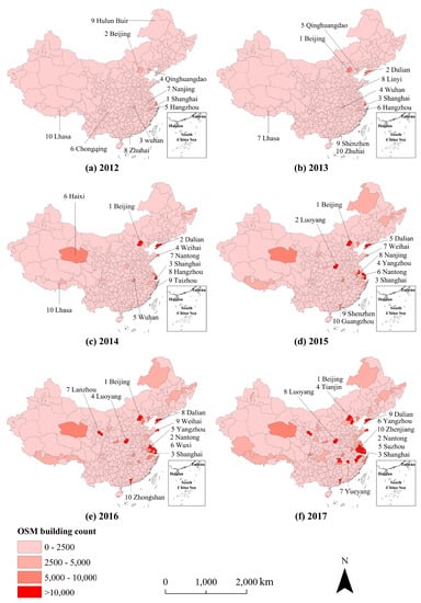 - The number of OSM building data was less than 2500 in 2012 for 329 out of the 334 prefecture-level divisions in China. However, the number for 21 prefecture-level divisions, mostly located on the eastern coast of China, was greater than 10,000 in 2017. Although the number of OSM building data in Beijing exceeded 40,000, those for 83% of prefecture-level divisions were still less than 2500.