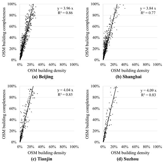 Four metropolises in China (Beijing, Shanghai, Tianjin, and Suzhou) were used to investigate the relationship between OSM building density and OSM building completeness. They were chosen because the corresponding reference building data were available. Figure 5 plots the line correlations for these four metropolises. It can be seen in the figure that the slope varies from 3.84 to 4.09, which is almost consistent with that (3.4–4.0) found by Zhou [37]. It can be inferred from these line correlations that OSM building data in a grid cell tend to be complete, while OSM building density of this grid cell is higher than 25%. Therefore, 25% was used as a threshold to determine high-density grid cells, in spite of the fact that some low-density grid cells may still be complete [37].