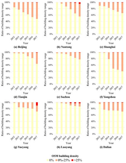 Figure 6 plots OSM building densities for nine prefecture-level divisions from 2012 to 2017. The x-axis denotes the year, and the y-axis denotes the number of grid cells within a certain building density range in proportion to the total number of grid cells completely located within urban areas in each prefecture-level division. These divisions were chosen because they were ranked top in terms of OSM building count.