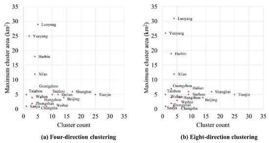Figure 7 plots the relationships between the cluster count and maximum cluster area, using the clustering approach proposed in Section 3 for two different cases. Figure 7 shows that for most prefecture-level divisions, the cluster count was no more than five, and the maximum cluster area was smaller than 5 km2. However, for some prefecture-level divisions (e.g., Beijing, Shanghai, Tianjin, Dalian, and Suzhou), the cluster count was much larger than 5. Conversely, for others (e.g., Luoyang, Yueyang, Harbin, and Xi'an), the maximum cluster area was much larger than 5 km2. This indicates that the spatial distribution pattern of high-density grid cells varied among different prefecture-level divisions.