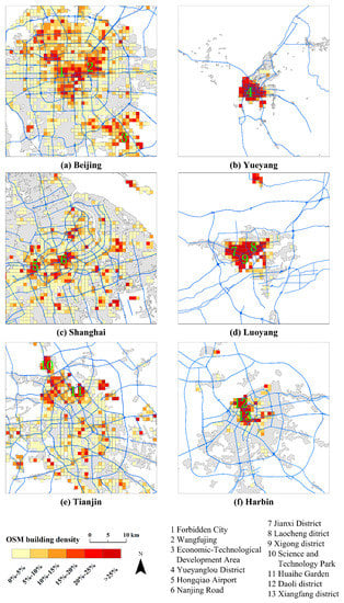(a–f) Density distributions of OSM building data for six typical metropolises in China, in 2017.