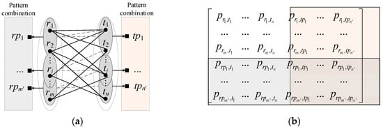 Let two building datasets be R = {ri|i = 1, …, m} and T = {tj|j = 1, …, n}. We suppose that R is the reference dataset and T is the target one. On the one hand, due to inconsistent LODs between crowdsourced and authoritative building datasets, it is difficult to assert whether T has a higher LOD than S, leading to the problem of matching direction [24]. On the other hand, since traditional relaxation labelling methods ignore total matching confidences for multiple cardinalities, this paper aggregates candidate-matching objects into pattern combinations to represent simultaneous matches with multiple objects. As illustrated in Figure 2, rp1…rpm’ and tp1…tpm’ are the aggregated pattern combinations in R and T. This paper calculates not only the matching probabilities of individual objects (ri, tj), but also calculates those of pattern combinations (ri, tpj) or (rpi, tj) to constitute a matching matrix. After that, the compatible influences of neighboring objects and pattern combinations are taken into account to heuristically update the initial matching matrix for a global matching consistency.