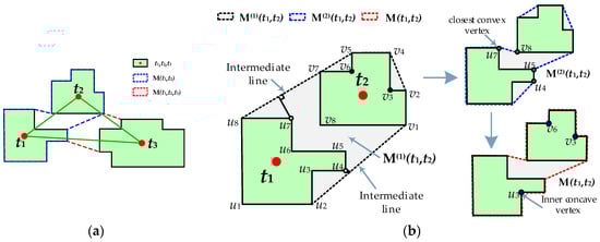As shown in Figure 4b, for two objects t1 = <u1, …, u8> and t2 = <v1, …, v8>, the convex hull was first initialized as the pattern combination M(1)(t1, t2) = <u1, u2, v1, v2, v4, v5, v7, u8>, of which two segments s1 = <u2, v1> and s2 = <v7, u8> were found as the intermediate lines that connect the vertexes of t1 and t2. Secondly, the convex points closest to the intermediate lines (e.g., u7, u4, v8 and u5) were iteratively added to refine the pattern combination as M(2)(t1, t2). Finally, the inner concave points within objects t1 and t2 (e.g., u3, v3 and v6) were inserted to refine the pattern combination as M(t1, t2).