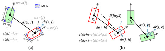 As shown in Figure 5a, ds(i, j) means the centroid distance between two objects ri and tj, dr(i, j) denotes their wall statistical weighting orientation (WSW) [44] difference, elg(*) indicates the major–minor axis ratio of the minimum enclosing rectangle (MER), and area(*) measures the polygon area. After that, the initial matching probability is calculated by:
