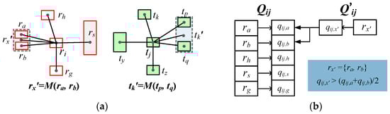 - Calculate the sub-support indexes of all neighboring individual objects and pattern combinations according to Formula (8), which are partitioned into two separate queues of Qij and Q’ij. Qij stores the sub-support indexes of neighboring individual objects and Q’ij stores the sub-support indexes of neighboring pattern combinations. For the candidate-matching pair (ri, tj) in Figure 6a, two sub-support index queues Qij and Qij’ are listed in Figure 6b.