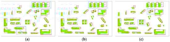 Matching results comparison of the mock building data: (a) the initial matching pairs based on local geometric similarity; (b) the identified matching pairs by the object-level relaxation labelling method; (c) the identified matching pairs by the pattern-level relaxation labelling method.