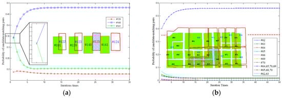 Figure 9 displays the probability change of candidate-matching pairs of objects #125 and #26 during the relaxation labelling process. As shown in Figure 9a, the relaxation labelling process correctly distinguishes fake matching pairs (#125 → #141) and true matching pairs (#125 → #140) by integrating contextual information of neighboring matching pairs to heuristically amend the local-similarity-based matching matrix. This indicates the proposed method can efficiently overcome incorrect matching caused by shape homogenization and non-rigid deviation. Meanwhile, as depicted in Figure 9b, the pattern-level matching method correctly identifies a complex 1:M matching pair of (#26 → #64, 65, 70, 69) by considering pattern combinations in the relaxation labelling model. This demonstrates our method can efficiently find various 1:M and M:N correspondences possibly missed by the object-level matching method.