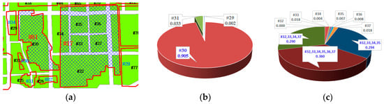 The matching probability distributions of object #81 and #17 in Figure 10a are elaborated in Figure 10b,c, respectively. It can be seen that both 1:1 object correspondence (#81 → #30) and 1:M pattern combination matching (#17 → #32, 33, 34, 35, 36, 37) are reliably identified in terms of a large probability gap. That indicates our method is relatively less sensitive to spatial scale differences than the object-level relaxation labelling method.