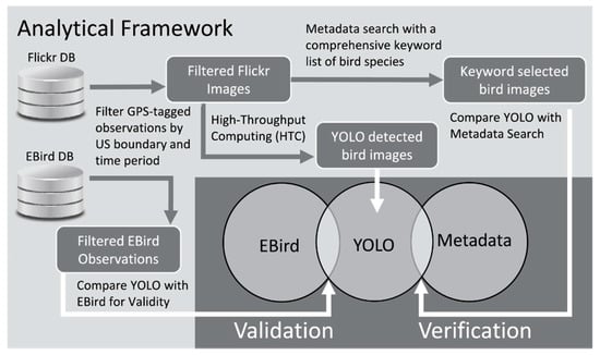 In this study, we introduce an analytical framework to: (1) assess the utility of a computer vision algorithm, YOLOv3 (You Only Look Once) [], in capturing semantics by detecting objects in image content; and (2) identify spatial and temporal footprints of human activities, and better understand the biases and characteristics of social media images and user behaviors. Specifically, we used birdwatching as a case study to demonstrate the analytical framework, which consists of three steps. We first employed a computer vision algorithm, YOLOv3 (YOLO), which uses convolutional neural networks (CNN) to detect objects, i.e., birds, by analyzing the content of images such as color, shape, texture, and any other information related to the actual image itself. We then introduced verification and validation procedures to evaluate the accuracy and utility of the proposed framework for detecting birdwatching activities. For verification, we first compared the results of the computer vision algorithm to concept-based image retrieval, which was based on keyword search on image metadata such as textual description, tags, and titles of images. Second, in order to capture potential biases in geo-tagged images, we compared the patterns in birding activity generated using Flickr bird photographs with patterns identified using eBird data (http://eBird.org/content/eBird/), a freely-available, global, citizen science online bird observation dataset collected and maintained by the Cornell Lab of Ornithology and the National Audubon Society []. eBird data have been used in a wide variety of ornithological studies across broad spatial and temporal scales. eBird observations are expert-verified, and are considered to be highly accurate [,]. As such, comparing our assessment of birding activity using Flickr images to eBird data for the same period allowed us to identify the biases of each data source, and the potential utility of Flickr in capturing birdwatching behavior.