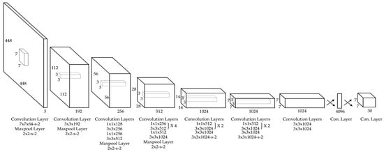 The initial 24 convolutional layers of the network extract features from the image, and the two fully connected layers predicted the output bounding boxes and class probabilities. The output of the system was stored as an S × S × (B * 5 + C) tensor. A typical network architecture with S = 7, B = 2, C = 20 is shown in Figure 3 [].