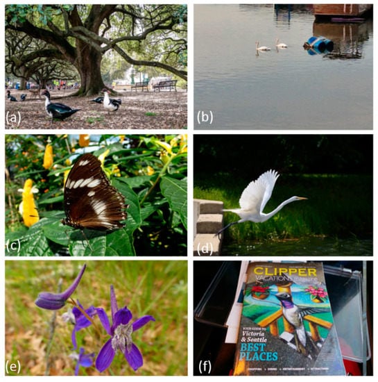 Although YOLO detection had an accuracy of 89% in classifying birds, Figure 4 represents a variety of sample cases of accurate and inaccurate classifications of YOLO. Figure 4a,b,d represent accurate classifications of birds. The algorithm detected two birds in Figure 4a with an estimated accuracy of 60% and 59%, although there were obviously more birds (five) in this image. However, since the image was not tagged with bird keywords it was not captured by the metadata search. The algorithm also detected a bench with 60% accuracy, although there were multiple benches in this photograph. Both birds in Figure 4b were accurately detected by 85% and 80% estimated accuracy, and the bird in Figure 4d was accurately detected by an accuracy of 98%. Although the rest of the images in Figure 4c,e,f do not contain birds, they were inaccurately classified by YOLO as containing birds. The shape of a butterfly in Figure 4c and the shape of the flowers resemble features of a bird such as the wings, neck, and beak, which possibly led to misclassification. However, classification accuracy for these two images were low, 54% and 51%, respectively. As we did not include a threshold, we included any classification regardless of the probability value provided by YOLO. Finally, Figure 4f contains a realistic drawing of a hummingbird, which was classified as a bird by YOLO. This classification illustrates the case where classification is algorithmically accurate, but semantically inaccurate as the purpose is to identify real birds.