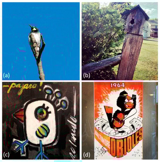 Figure 5 represents bird images detected by only the metadata and not YOLO. Figure 5a is an accurate classification of a woodpecker, a common bird species thanks to the title of this image “Acorn woodpecker”. YOLO algorithm was not able to detect the bird in this photograph because of how the bird had blended well with the tree branch, which concealed the major features of the bird for objection detection. On the other hand, Figure 5b–d do not contain real birds but they commonly contain “bird” “keywords”.