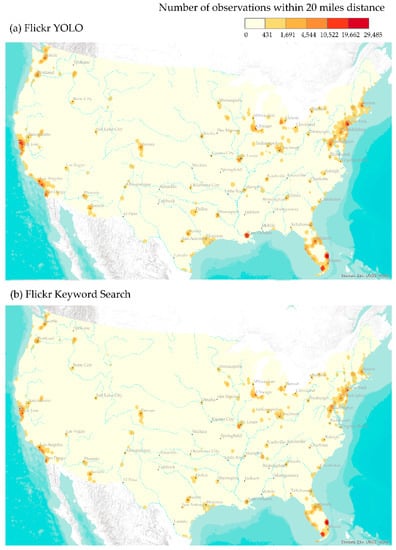 Fixed-distance (20 miles) density of (a) YOLO-detected and (b) keyword search Flickr bird image counts.