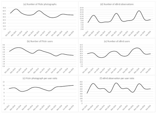 While eBird data have been used in a wide variety of ornithological studies across broad spatial and temporal scales [,], and the data source has a number of significant biases due to a variety of reasons such as users, locations, and time periods. For example, while in the earlier periods citizen scientists collected information from a diverse set of species, in recent years citizen scientists have been biased towards collecting information on threatened species and protected areas []. On the other hand, Flickr users are usually photographers who are also birdwatchers, who not only upload their images, but also decide to geotag and share them. Our results comparing the spatial distribution of the two datasets highlight similar results as well as some geographic variations, which can be attributed to the potential biases among citizen science and social media applications and users. While eBird users are more likely to travel long distances for bird observations, Flickr users are casual birdwatchers who are likely to take bird photographs around their usual activity spaces. Future studies on extracting the mobility patterns of eBird and Flickr users can help better understand the dynamics of birdwatching activities.