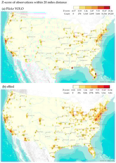 Z-scores of the fixed-distance (20 miles) density of (a) YOLO-detected Flickr bird image and (b) eBird observations.