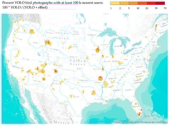 Figure 9 illustrates the percentage of YOLO-detected Flickr bird images among both Flickr and eBird observations. This figure represents the bi-polar ratio of Flickr to eBird, and highlight areas where YOLO-detected Flickr photographs are above 1% using adaptive kernel smoothing that employs the 100 nearest users (both Flickr and eBird) to identify the neighborhood in the smoothing parameter. Figure 9 highlights prominent areas of Flickr bird photographs in natural lands that provide nesting, stopover, and overwintering habitat for birds. Interestingly, the spatial patterns were very distinct and different from fixed-distance density distribution, and provided a valuable input where Flickr usage was relatively higher in comparison to eBird. Regardless of the difference between the number of observations between Flickr and eBird, Flickr bird photographs were prominent (over 10%) in areas where there was access and infrastructure for birdwatching across the nation. The example areas where Flickr bird photographs were relatively higher are Grand Canyon River and Colorado Plato, Yellow Stone National Park, Southern Colorado, national preserves and wildlife areas in Southern Florida, and the wetland and prairie lands in the Mid-West. These Flickr users likely represent tourists who are not serious birdwatchers.