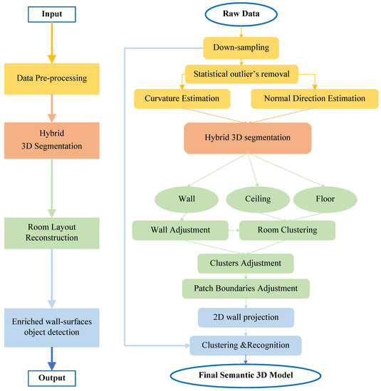 Recently, 3D building modelling has attracted the attention of several scholars in disciplines, such as photogrammetry [1,2,3], geo-informatics [4,5,6], and computer graphics [7,8,9,10]. Indoor scene reconstruction has been found to be a more challenging task than that of the outdoor scenes, as such areas tend to have high clutter. Indoor models have a valuable role in many applications, such as planning and building construction monitoring, localization and navigation services in public buildings, virtual models for historical and cultural sites, city planning decision making, and accelerating the construction process using a digitized model [6,11]. Three major reasons have been identified as driving forces behind 3D building modelling: The necessity to (a) reduce the data used, (b) extract and reconstruct objects from unstructured 3D point clouds, and (c) fit semantics to buildings [12].