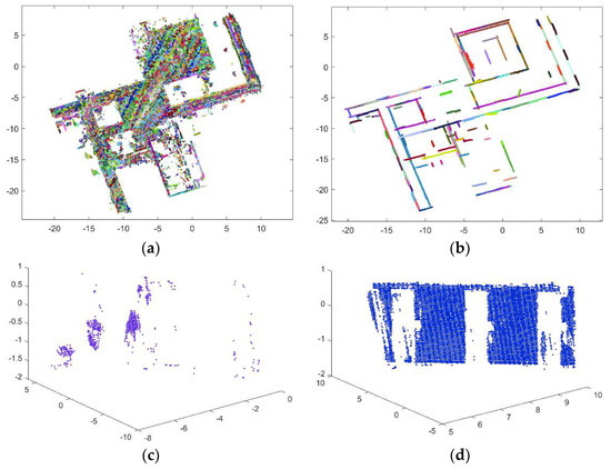 Wall segments analysis: (a) Raw wall segments; (b) pruned wall segments; (c) side view of the false wall; and (d) side view of actual wall segments.