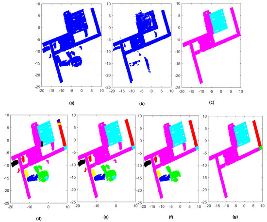 Clustering procedures: (a,b) Ceiling and floor; (c) results; (d–g) enhancement of clusters.