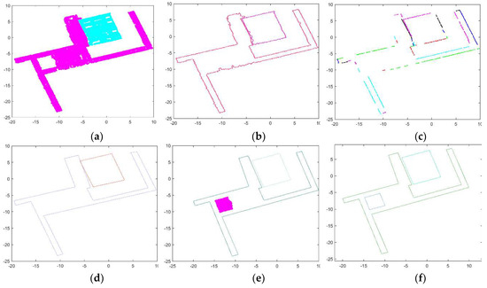 Boundaries detection: (a) Room clusters, (b) detected boundary points, (c) detected line segments, (d) intersected lines, and (e,f) detecting holes and reconstructed segments.