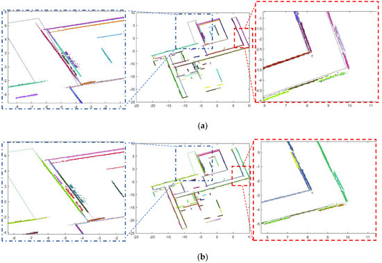 Adjustment of wall segments using points of vertical planes: (a) Before adjustment; and (b) after adjustment.