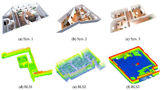 The datasets used for evaluating our approach: (a–c) Synthetic datasets [8], and (d–f) backpack laser scanner (BLS) datasets (colors indicate different height).