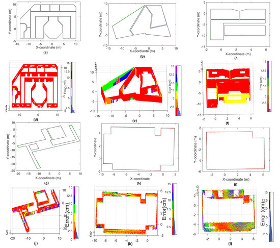 (a–f) Evaluation of reconstructed models from synthetic datasets: (a–c) Comparison of the 2D floor plans (black lines) and reconstructed models (colored lines), and (d–f) distance of points to the nearest reconstructed plane (a histogram of errors is shown at right side). (g–l) Evaluation of reconstructed models from BLS: (g–i) Comparison of the 2D floor plans (black lines) and reconstructed models (colored lines), and (j–l) distance of points to the nearest reconstructed plane (a histogram of errors is shown at right side).