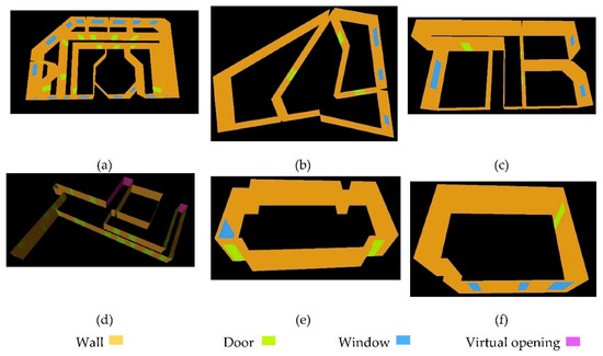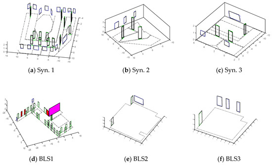 Evaluation of wall-surface objects from the constructed model from our approach (blue color for the window, green color for the door) and reference model (black color) for (a–c) synthetic datasets and (d–f) BLS datasets. (red polygon for missed doors, and a magenta polygon for false virtual opening).