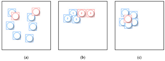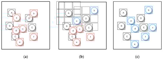 A simple example is used to explain the displacement process: (a) original state; black symbols have been added to the map and red symbols need to be processed; (b) blue symbols have been processed; (c) all the symbols have been added to the map.