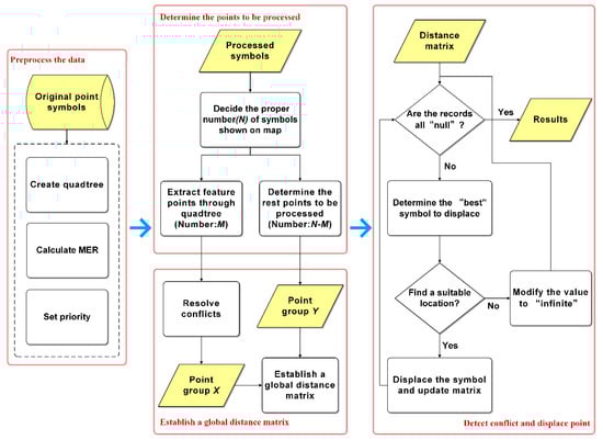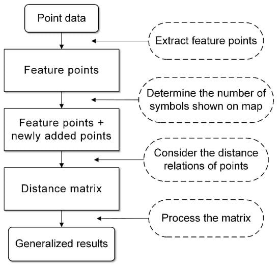 In light of that problem, we decided to design a sequential displacement algorithm to ensure high efficiency. The spatial distribution characteristics of a point group, including the spatial structure and holistic distance relations, are considered to ensure good generalization quality. In order to conserve the distribution characteristics, the subset of point groups that can exhibit the spatial structure should be extracted and added to the map first. Because the space on a map is finite and the map should be legible, we can quantify the map information or use other methods to determine the total number of symbols to be shown on the screen, thus we can decide how many points will be selected to process by the difference between the total number and the number of above subset and what they are by attribute priority. The holistic distance relations of points are used when deciding which symbol will be added to the map instead of using a fixed order formed by attribute priority. At each displacement time, the algorithm creates or updates a global distance matrix for the symbols already shown on the map and the symbols to be handled, choosing the minimum value record to process. In this way, the method will preserve more symbols and holistic distribution patterns compared to previous methods. Figure 2 shows the main workflow of the idea.
