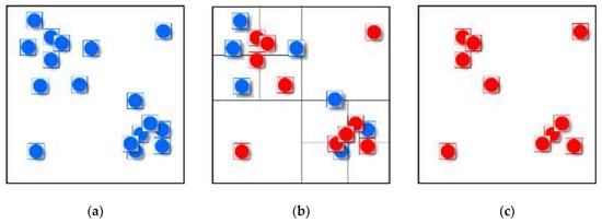 Real point of interest (POI) dataset and preprocessing before main displacement process: (a) original points is divided into three groups; (b) feature points selected by quadtree; (c) three point groups represented by different colors.