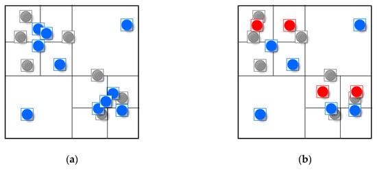 Preliminarily resolving conflicts among feature points by moving symbols to their grid center: (a) the blue symbols are feature points shown in Figure 4c; (b) once a symbol of feature point overlaps another one, both of them will be moved to their grid center, so that there will be no conflicts among the symbols of feature points.