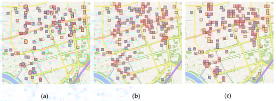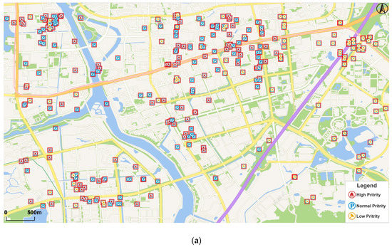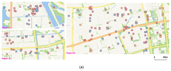 First of all, we need to discuss the definition of “large scales” in the paper. According to different purposes, there are different standards of the concept (e.g., in China, economic development departments define large scales in topographic maps as scales greater than 1:10,000, while large scales defined by engineering surveying departments are scales greater than 1:2,000) [30]. Users will focus more on specific locations and detailed information of POI data when they are using a city map or a tourist map and a displacement operator should be used in these maps to enhance their practicability. Since 1:25,000 topographic maps are mostly used to conduct research in relatively small areas, meeting the requirements of urban planning and design [31], we define large scales in this paper as scales greater than 1:25,000. The nearest LOD corresponding to the scale in TianDitu is LOD 15 and generalization results will be better at large scales, so this is why we mainly show the experiment results at this LOD.