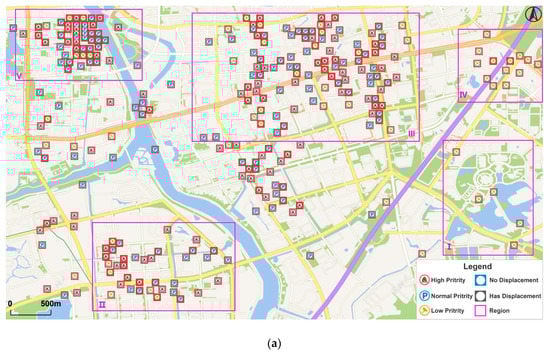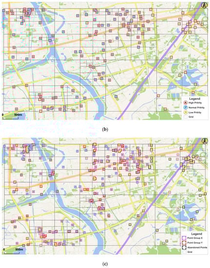 The POI dataset needs to be preprocessed before the main displacement process. As introduced previously, a quadtree is created to extract feature points that conserve the main spatial structures and the algorithm selects the highest priority point in each grid (Figure 7b). The point group X is obtained by resolving conflicts among feature points, while point group Y is determined by the priority of the rest of the points. Other points will be abandoned, as most of them have a low priority. The three point groups are shown in Figure 7c with different colors.