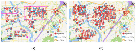 The proposed displacement algorithm was implemented in Java by IntelliJ IDEA and we tested it on Google Chrome. The foreground data used for the experiment is a real POI dataset in Jiangning district from Baidu Map (https://lbsyun.baidu.com/index.php?title=webapi) and Amap (https://lbs.amap.com/api), which have 304 points in the area after data deduplication, with a high density. The format of POI data is JSON and data will be sent to the background through Ajax. After processing, POI data with new locations are achieved and then OpenLayers is used to add generalized points on a base layer (e.g., Baidu Map, Google Map and Bing Map). Symbols were divided into three groups by randomly generated attribute values. The order of importance of the symbols representing different groups is red, then blue, then yellow (Figure 7a). We used the background map from TianDitu (based on OGC Web Map Title Service standard, https://map.tianditu.gov.cn), the scales and the levels of detail (LODs) of which are the same as those of Google Maps.