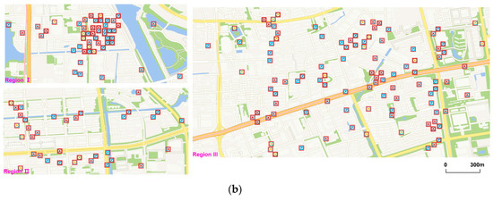 Original points and generalization results at LOD 16. (a) original points in three regions (shown in Figure 10a) at LOD 16; (b) generalization results in these regions at LOD 16.