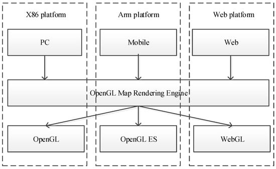 Li implemented a set of cross-platform graphics library (UGraphics) based on the rendering characteristics of the map for related optimization to achieve cross-platform mapping in SuperMap mobile GIS [22]. The map rendering engine uses a graphics library provided by the operating system. For example, the Windows operating system uses GDI (Graphics Device Interface). The Linux operating system uses XLib, GTK, and Qt. The mobile device Android uses Skia, and the iOS uses Quartz. With the increasing use of mobile hardware and operating systems, this problem is increasingly hard to solve. Li developed a bitmap map rendering engine, which implements the related graphics image algorithm. This map rendering engine solves the reliance on the operating system graphics library and solves the cross-operating system problem. It has been used in SuperMap GIS platform software products for nearly ten years. However, devices such as iPad have the demand for explosive growth of graphics acceleration hardware (GPU) and Web applications. The bitmap map rendering engine cannot use the GPU for the acceleration of map rendering and the bitmap engine has low performance for large-scale data, and does not support map rendering on a web browser.